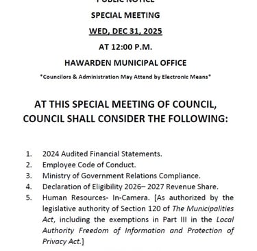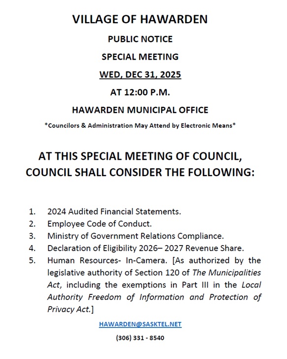 The Next Regular Meeting Of Council will be held Thursday, Jan 15, 2026 at the Hawarden Municipal Office at 7 p.m. Office hours will be held from 2 p.m. - 6:30 p.m. Jan 15. Administration can be reached at hawarden@sasktel.net or by telephone (306) 855 - 2020. 2025 tax payments are due Dec 31,2025. 18% Interest will be applied to all 2025 Taxes unpaid Jan 1, 2026. ETransfers may be sent to hawarden@sasktel.net security questions and passwords will not be required.